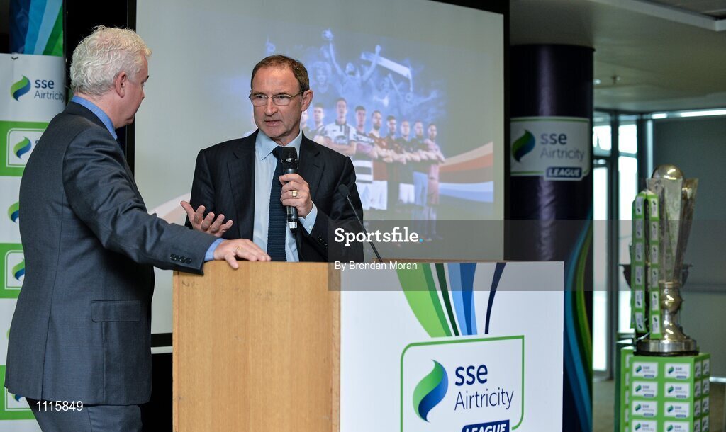 24 February 2016; Republic of Ireland manager Martin O'Neill, right, is interviewed by MC Con Murphy during the launch of the 2016 SSE Airtricity League. Aviva Stadium, Dublin. Picture credit: Brendan Moran / SPORTSFILE
