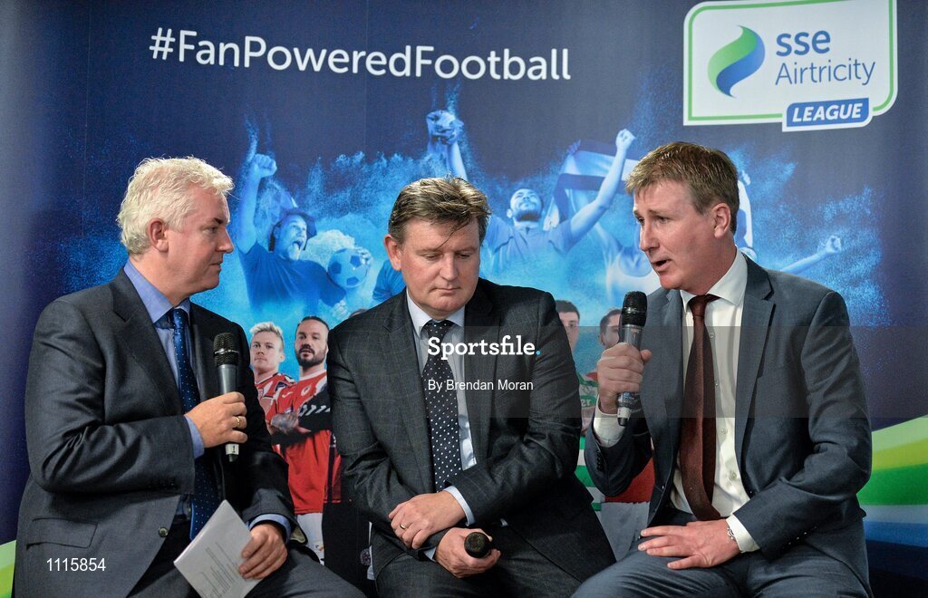 24 February 2016; Dundalk manager Stephen Kenny, right, and Limerick FC manager Martin Russell are interviewed by MC Con Murphy, left, during the launch of the 2016 SSE Airtricity League. Aviva Stadium, Dublin. Picture credit: Brendan Moran / SPORTSFILE