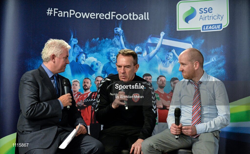24 February 2016; Derry City manager Kenny Shiels, centre, and Wexford Youths manager Shane Keegan, right, are interviewed during the launch of the 2016 SSE Airtricity League. Aviva Stadium, Dublin. Picture credit: Brendan Moran / SPORTSFILE