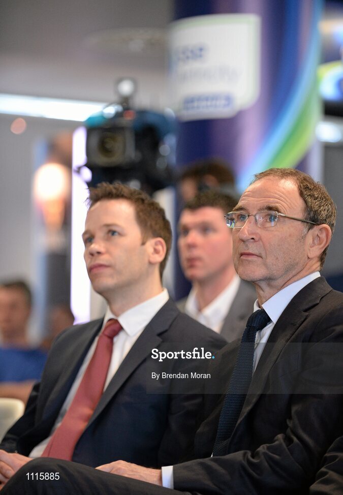 24 February 2016; In attendance at the launch of the 2016 SSE Airtricity League are Ronan Brady, left, Head of Digital & Marketing, SSE Airtricity, and Republic of Ireland manager Martin O'Neill. Aviva Stadium, Dublin. Picture credit: Brendan Moran / SPORTSFILE