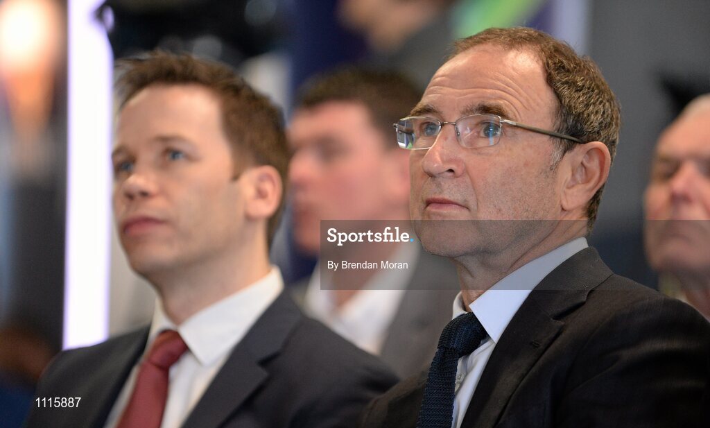 24 February 2016; In attendance at the launch of the 2016 SSE Airtricity League are Ronan Brady, left, Head of Digital & Marketing, SSE Airtricity, and Republic of Ireland manager Martin O'Neill. Aviva Stadium, Dublin. Picture credit: Brendan Moran / SPORTSFILE