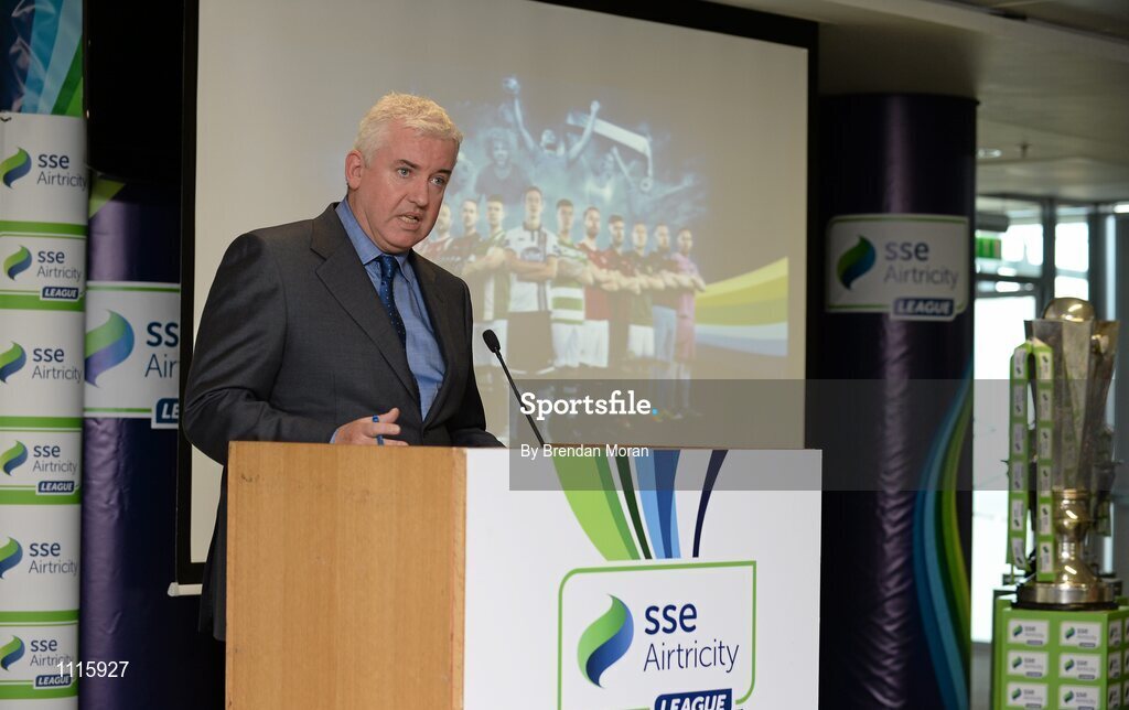 24 February 2016; MC Con Murphy speaking during the launch of the 2016 SSE Airtricity League. Aviva Stadium, Dublin. Picture credit: Brendan Moran / SPORTSFILE
