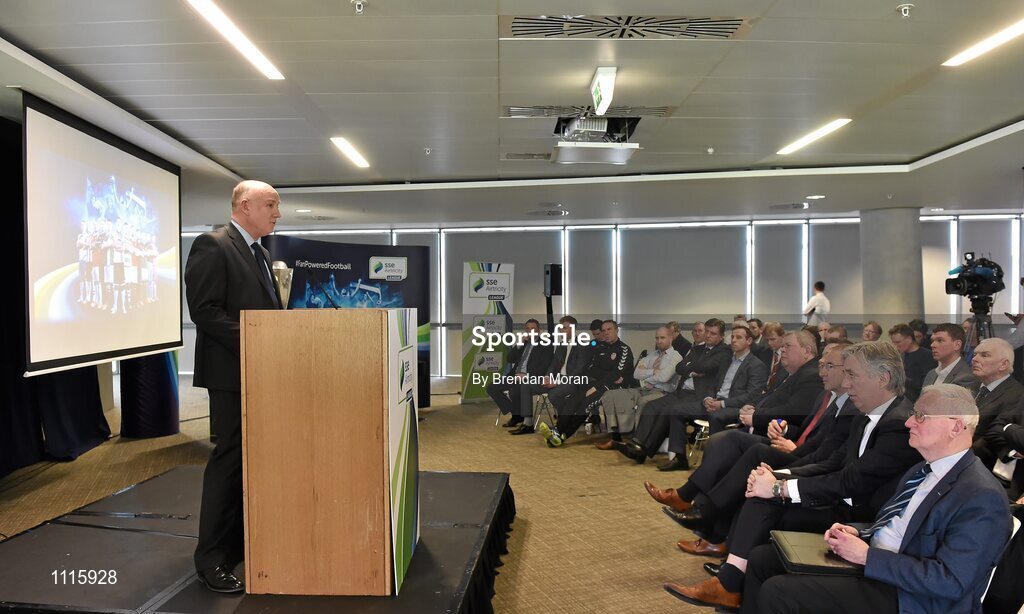24 February 2016; Speaking at the launch of the 2016 SSE Airtricity League is Fran Gavin, FAI Director of Competitions. Aviva Stadium, Dublin. Picture credit: Brendan Moran / SPORTSFILE