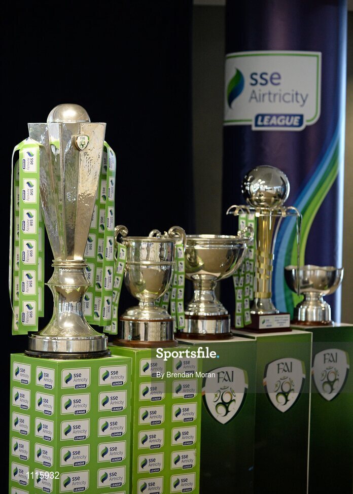 24 February 2016; A general view of the trophies at the launch of the 2016 SSE Airtricity League. Aviva Stadium, Dublin. Picture credit: Brendan Moran / SPORTSFILE
