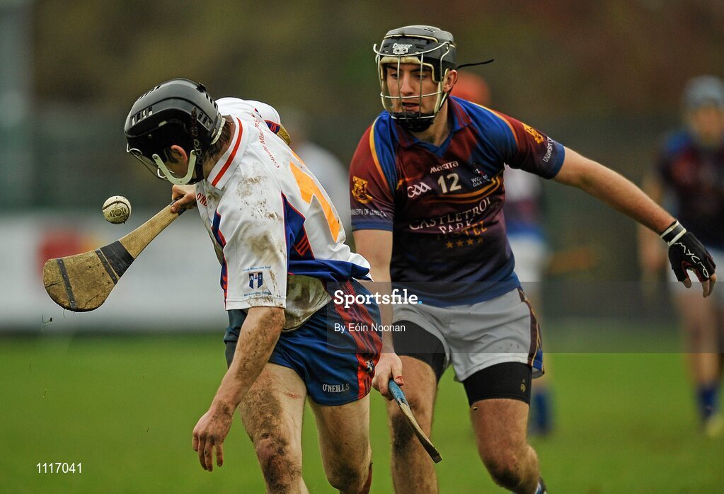 27 February 2016; Tommy Heffernan, Mary Immaculate College Limerick, in action against Conor Martin, University of Limerick. Independent.ie Fitzgibbon Cup Final, Mary Immaculate College Limerick v University of Limerick, Cork IT, Cork. Picture credit: Eóin Noonan / SPORTSFILE