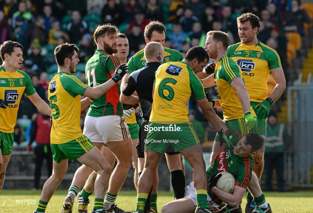 28 February 2016; Players from both sides involved in an incident in the second half after a penalty that was awarded to Mayo as Diarmuid O'Connor goes to ground. Allianz Football League, Division 1, Round 3, Donegal v Mayo, MacCumhaill Park, Ballybofey, Co. Donegal. Picture credit: Oliver McVeigh / SPORTSFILE