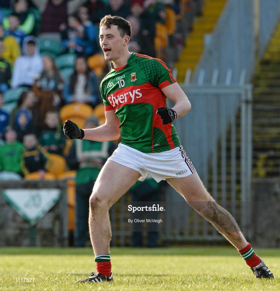 28 February 2016; Diarmuid O'Connor, Mayo, celebrates after scoring a goal from a penalty. Allianz Football League, Division 1, Round 3, Donegal v Mayo, MacCumhaill Park, Ballybofey, Co. Donegal. Picture credit: Oliver McVeigh / SPORTSFILE