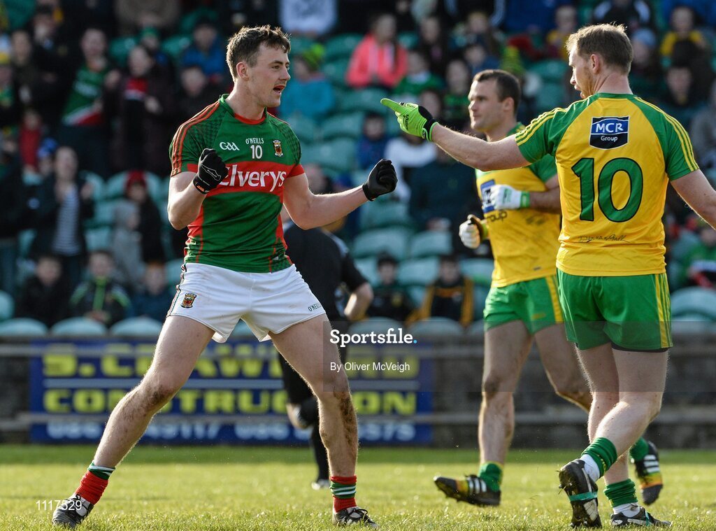 28 February 2016; Diarmuid O'Connor, Mayo, celebrates in front of Anthony Thompson, Donegal, after scoring a goal from a penalty. Allianz Football League, Division 1, Round 3, Donegal v Mayo, MacCumhaill Park, Ballybofey, Co. Donegal. Picture credit: Oliver McVeigh / SPORTSFILE