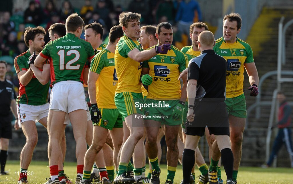 28 February 2016; Donegal players surround referee Barry Cassidy after he awarded a penalty to Mayo. Allianz Football League, Division 1, Round 3, Donegal v Mayo, MacCumhaill Park, Ballybofey, Co. Donegal. Picture credit: Oliver McVeigh / SPORTSFILE