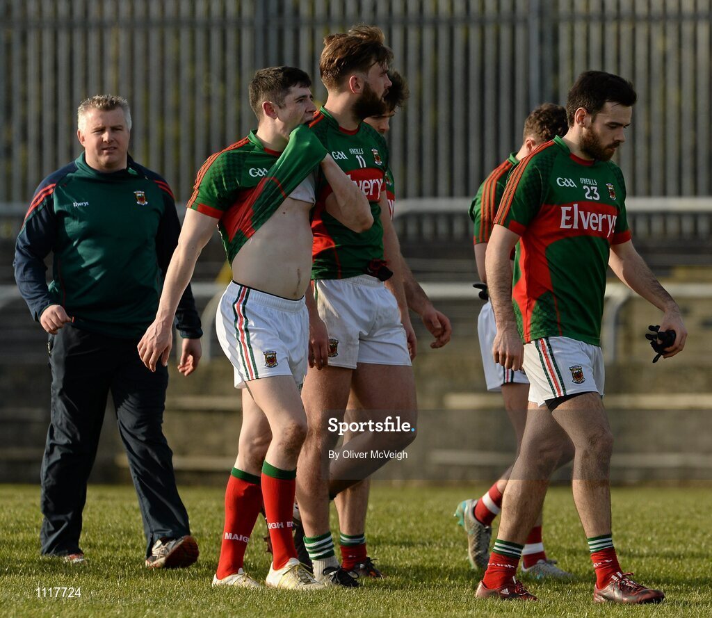28 February 2016; Disappointed Mayo players and Manager Stephen Rochford, leave the field after defeat to Donegal. Allianz Football League, Division 1, Round 3, Donegal v Mayo, MacCumhaill Park, Ballybofey, Co. Donegal. Picture credit: Oliver McVeigh / SPORTSFILE