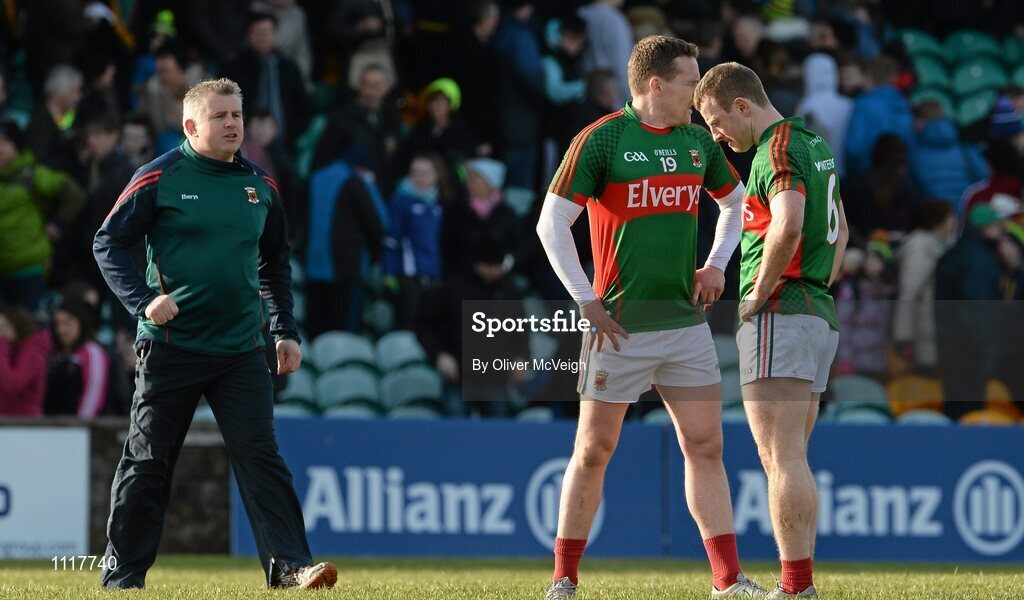 28 February 2016; A disappointed Andy Moran and Colm Boyle, Mayo, at the final whistle as manager Stephen Rochford comes on to the field. Allianz Football League, Division 1, Round 3, Donegal v Mayo, MacCumhaill Park, Ballybofey, Co. Donegal. Picture credit: Oliver McVeigh / SPORTSFILE