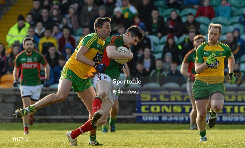 28 February 2016; Conor Loftus, Mayo, in action against Rory Kavanagh, Donegal. Allianz Football League, Division 1, Round 3, Donegal v Mayo, MacCumhaill Park, Ballybofey, Co. Donegal. Picture credit: Oliver McVeigh / SPORTSFILE