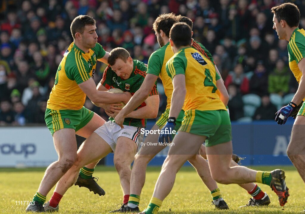 28 February 2016; Colm Boyle, Mayo, in action against Patrick McBrearty and Odhrán Mac Niallais, Donegal. Allianz Football League, Division 1, Round 3, Donegal v Mayo, MacCumhaill Park, Ballybofey, Co. Donegal. Picture credit: Oliver McVeigh / SPORTSFILE