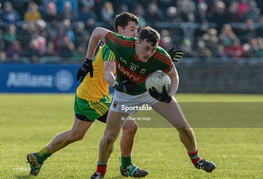 28 February 2016; Diarmuid O'Connor, Mayo, in action against Eoin McHugh, Donegal. Allianz Football League, Division 1, Round 3, Donegal v Mayo, MacCumhaill Park, Ballybofey, Co. Donegal. Picture credit: Oliver McVeigh / SPORTSFILE