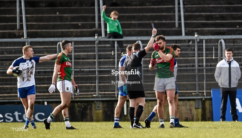 6 March 2016; Aidan O'Shea, Mayo, receives a black card from referee Joe McQuillan. Allianz Football League, Division 1, Round 4, Monaghan v Mayo. St Tiernach's Park, Clones, Co. Monaghan. Picture Credit: Philip Fitzpatrick / SPORTSFILE
