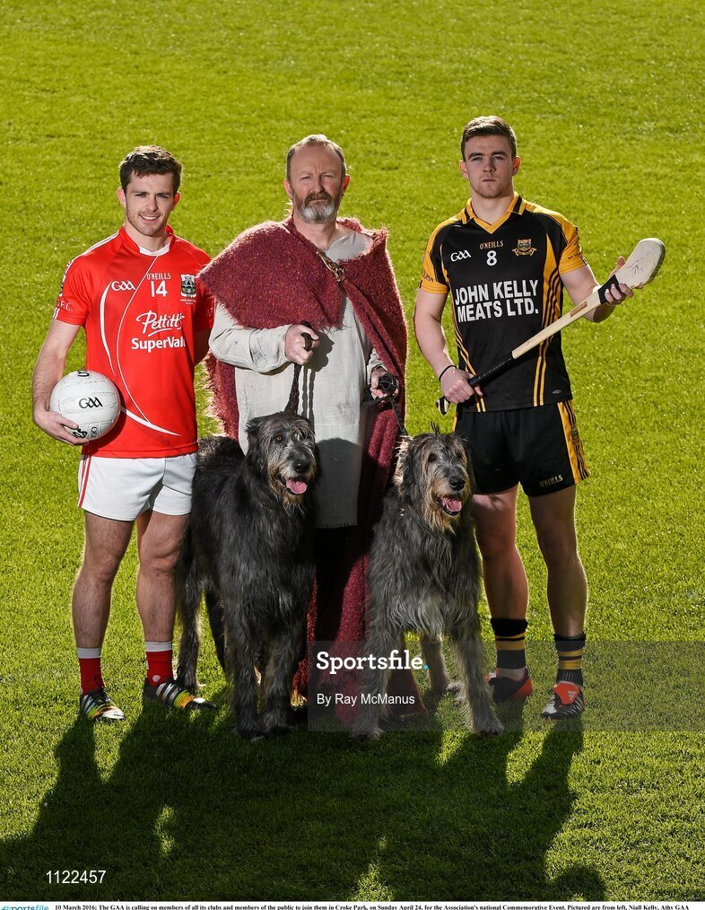 10 March 2016; The GAA is calling on members of all its clubs and members of the public to join them in Croke Park, on Sunday April 24, for the Association's national Commemorative Event. Pictured are from left, Niall Kelly, Athy GAA Club, Co. Kildare, Tony Dunne, with Irish Wolfhounds Aoife and Meabh, and Tony Kelly, Ballyhea GAA Club, Co. Clare. Croke Park, Dublin. Picture credit: Ray McManus / SPORTSFILE
