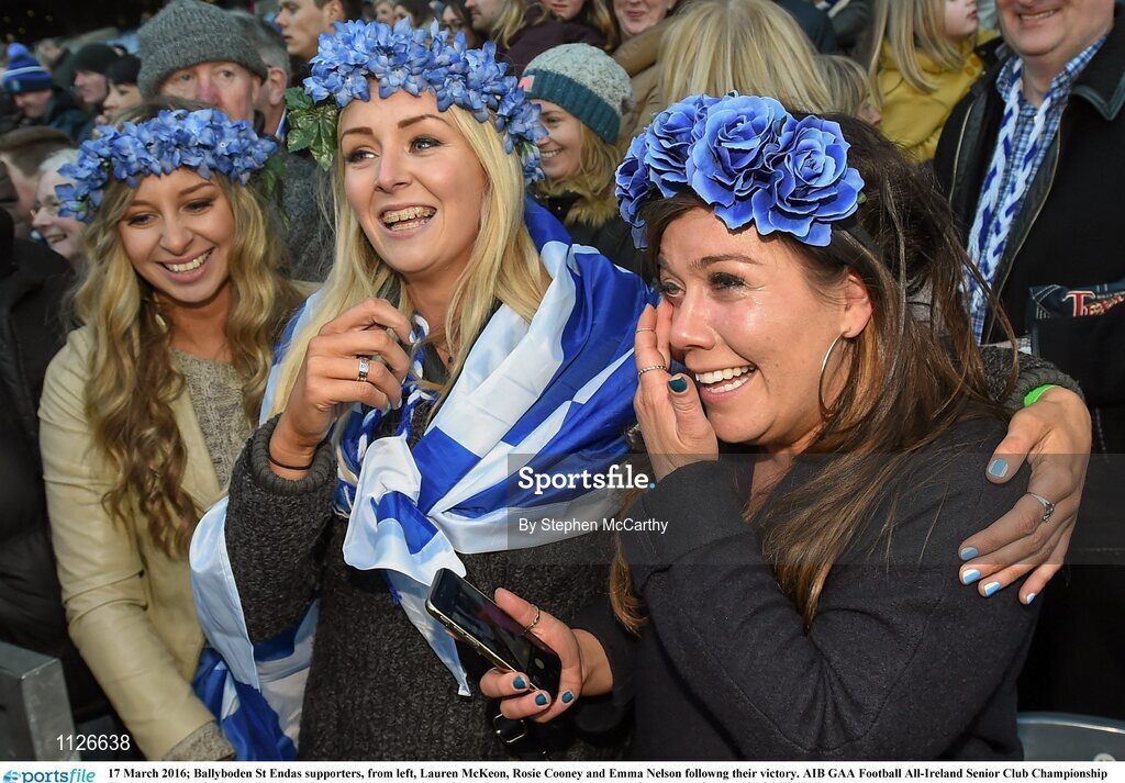 17 March 2016; Ballyboden St Endas supporters, from left, Lauren McKeon, Rosie Cooney and Emma Nelson followng their victory. AIB GAA Football All-Ireland Senior Club Championship Final, Ballyboden St Endas, Dublin, v Castlebar Mitchels, Mayo. Croke Park, Dublin. Picture credit: Stephen McCarthy / SPORTSFILE