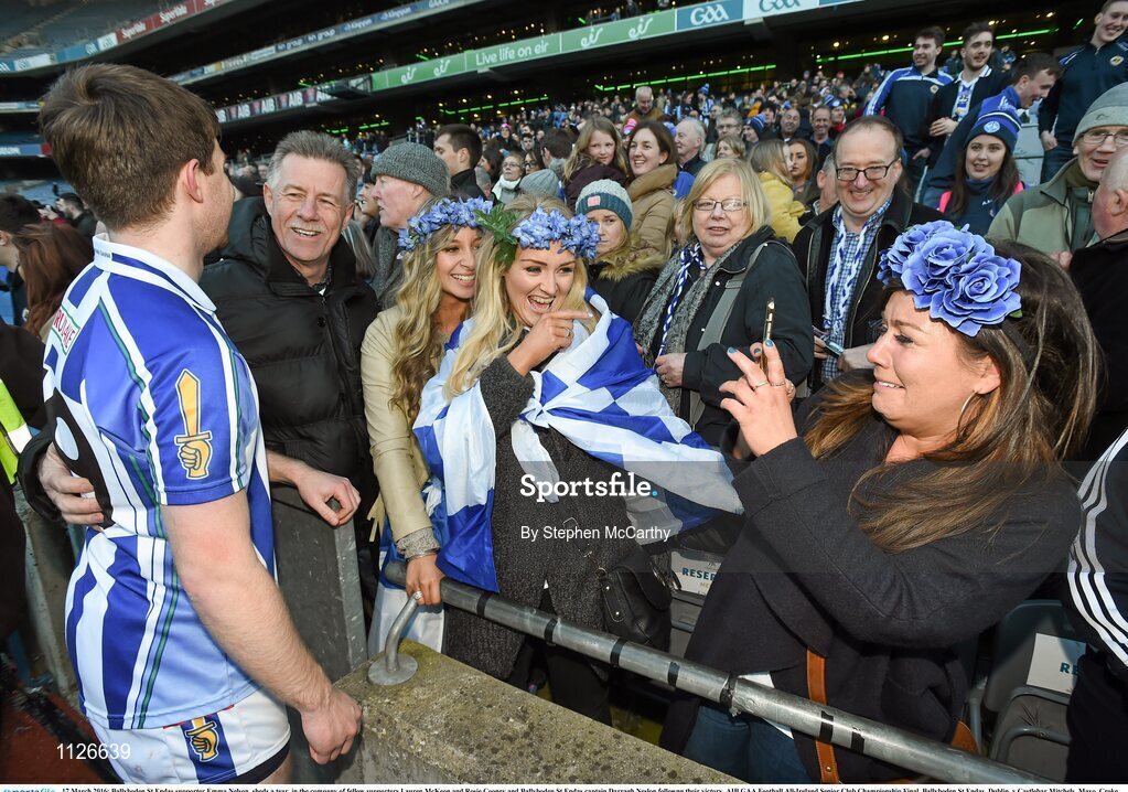 17 March 2016; Ballyboden St Endas supporter Emma Nelson, sheds a tear, in the company of fellow supporters Lauren McKeon and Rosie Cooney and Ballyboden St Endas captain Darragh Neslon followng their victory. AIB GAA Football All-Ireland Senior Club Championship Final, Ballyboden St Endas, Dublin, v Castlebar Mitchels, Mayo. Croke Park, Dublin. Picture credit: Stephen McCarthy / SPORTSFILE