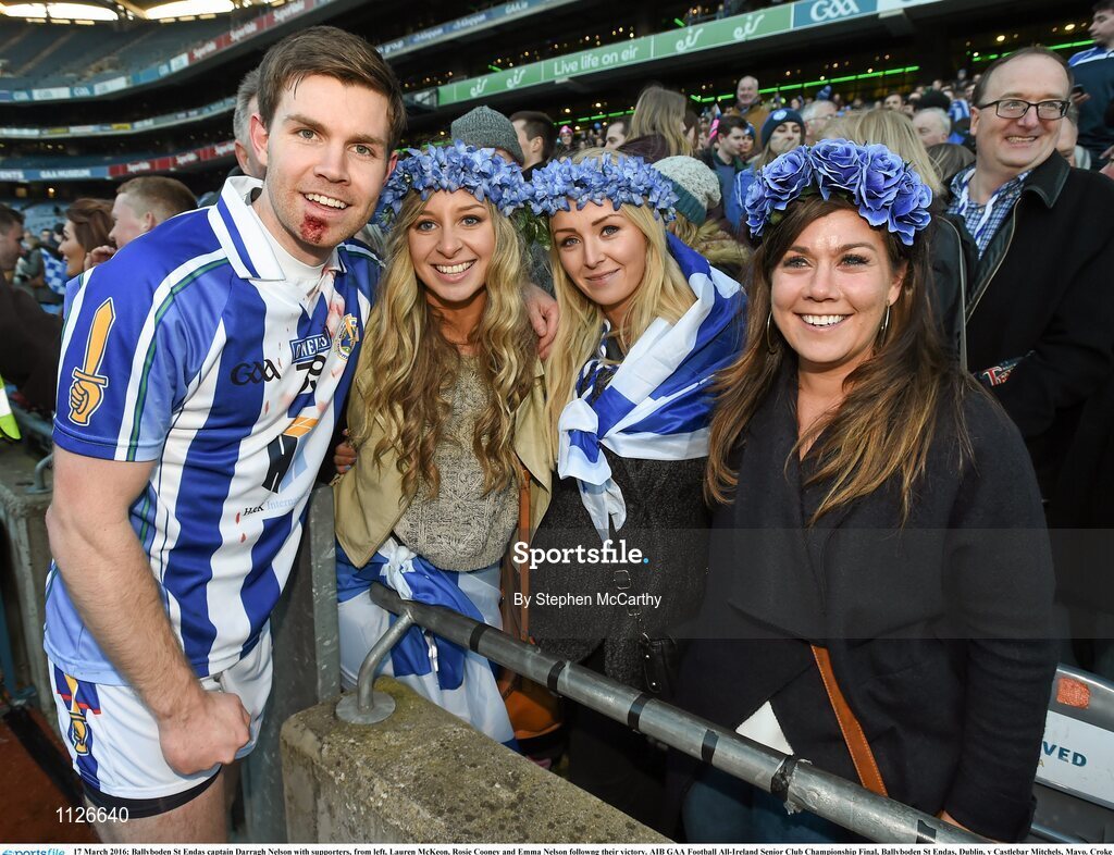 17 March 2016; Ballyboden St Endas captain Darragh Nelson with supporters, from left, Lauren McKeon, Rosie Cooney and Emma Nelson followng their victory. AIB GAA Football All-Ireland Senior Club Championship Final, Ballyboden St Endas, Dublin, v Castlebar Mitchels, Mayo. Croke Park, Dublin. Picture credit: Stephen McCarthy / SPORTSFILE