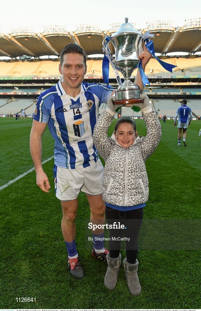 17 March 2016; Conal Keaney, Ballyboden St Endas, with his daughter Kate, age 7, following their victory. AIB GAA Football All-Ireland Senior Club Championship Final, Ballyboden St Endas, Dublin, v Castlebar Mitchels, Mayo. Croke Park, Dublin. Picture credit: Stephen McCarthy / SPORTSFILE