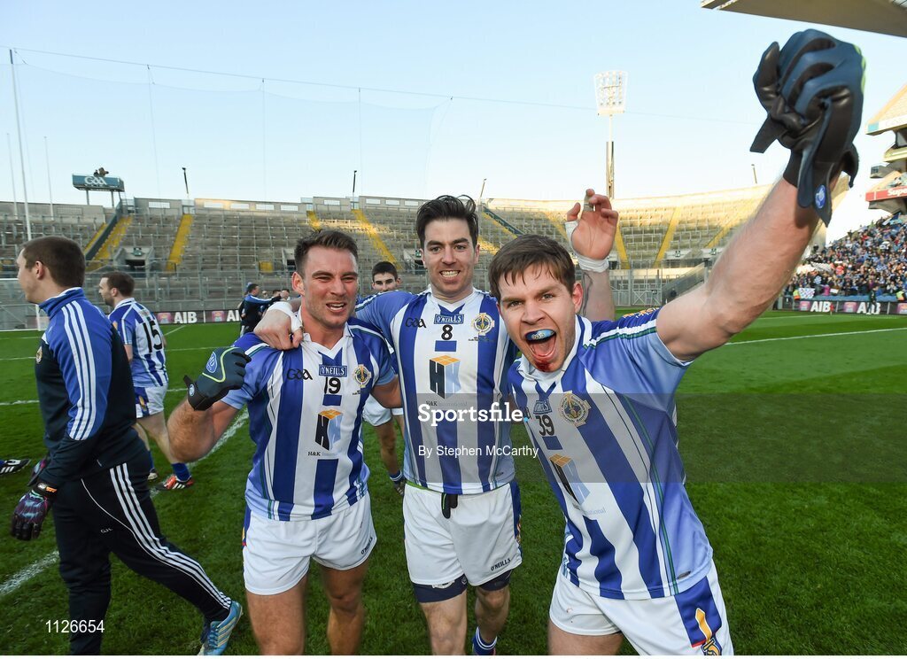 17 March 2016; Shane Durkin, Michael Darragh Macauley and Darragh Nelson, Ballyboden St Endas, celebrates their side's victory. AIB GAA Football All-Ireland Senior Club Championship Final, Ballyboden St Endas, Dublin, v Castlebar Mitchels, Mayo. Croke Park, Dublin. Picture credit: Stephen McCarthy / SPORTSFILE