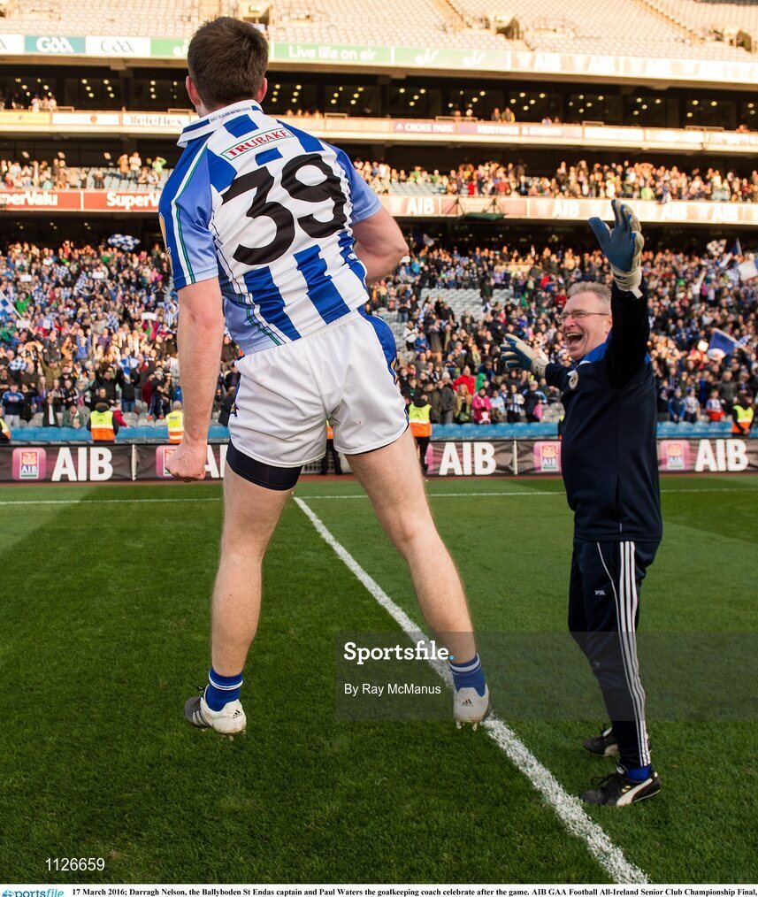 17 March 2016; Darragh Nelson, the Ballyboden St Endas captain and Paul Waters the goalkeeping coach celebrate after the game. AIB GAA Football All-Ireland Senior Club Championship Final, Ballyboden St Endas, Dublin, v Castlebar Mitchels, Mayo. Croke Park, Dublin. Picture credit: Ray McManus / SPORTSFILE