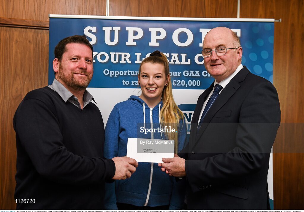 17 March 2016; GAA Vice President and Chairman of Leinster Council John Horan presents Margaret Fleming, Robert Emmets, Perrystown, Dublin, who was represented by her son-in-law Liam Byrne and Leah, who won All-Ireland Hurling Final Package 2016, during the presentation of prizes to the winners of the GAA National Club Draw. Nally Suite, Croke Park, Dublin. Picture credit: Ray McManus / SPORTSFILE