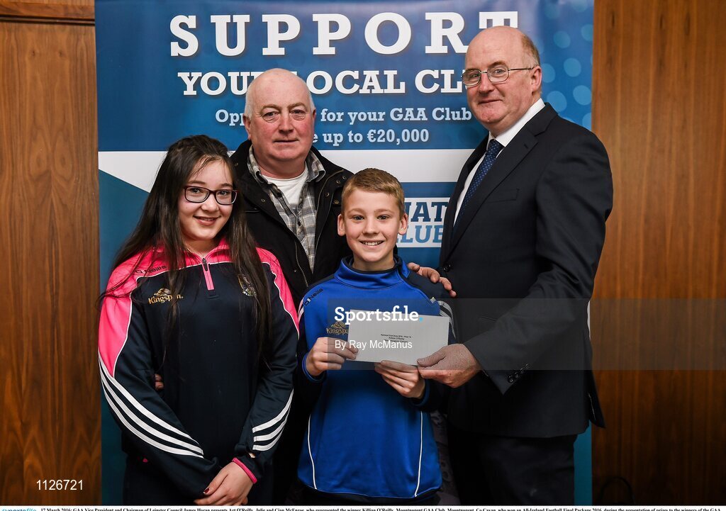 17 March 2016; GAA Vice President and Chairman of Leinster Council John Horan presents Art O'Reilly, Julie and Cian McEnroe, who represented the winner Killian O’Reilly, Mountnugent GAA Club, Mountnugent, Co Cavan, who won an All-Ireland Football Final Package 2016, during the presentation of prizes to the winners of the GAA National Club Draw. Nally Suite, Croke Park, Dublin. Picture credit: Ray McManus / SPORTSFILE