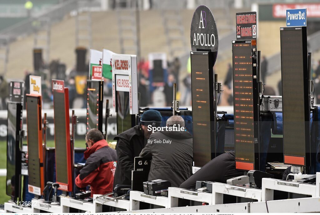 18 March 2016; A general view of bookmakers' boards ahead of Day 4 of the Cheltenham Festival. Prestbury Park, Cheltenham, Gloucestershire, England. Picture credit: Seb Daly / SPORTSFILE