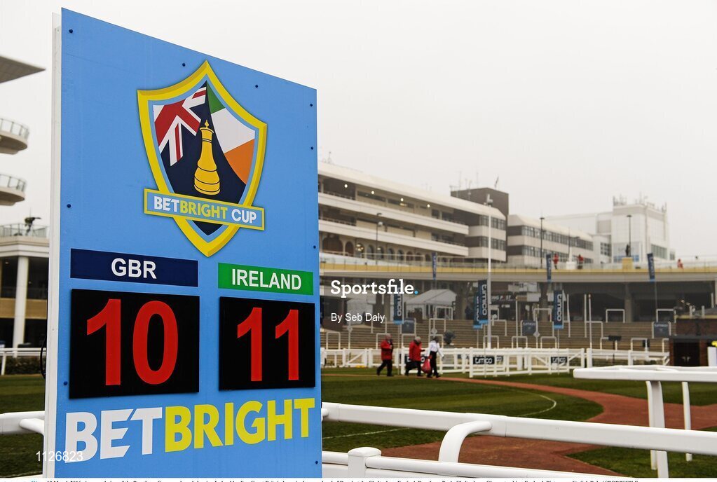 18 March 2016; A general view of the Prestbury Cup scoreboard showing Ireland leading Great Britain by a single race ahead of Day 4 at the Cheltenham Festival. Prestbury Park, Cheltenham, Gloucestershire, England. Picture credit: Seb Daly / SPORTSFILE