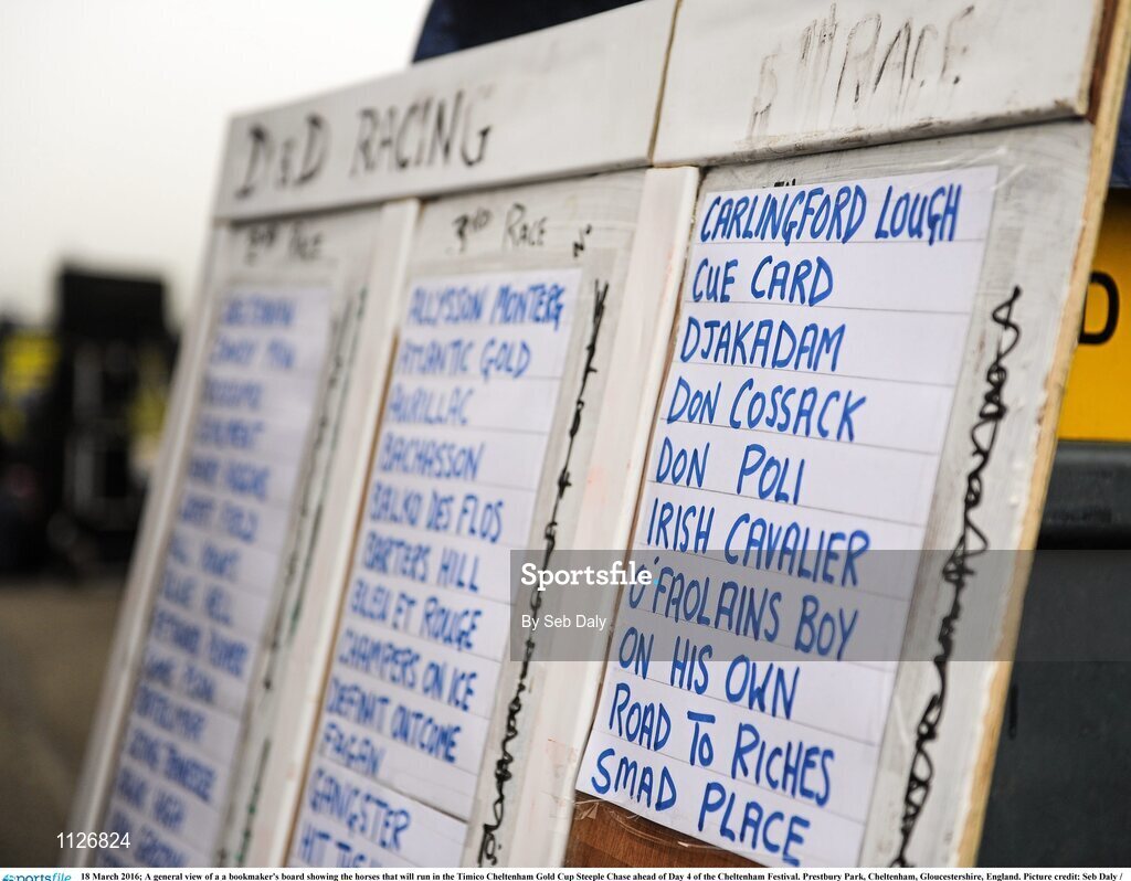 18 March 2016; A general view of a a bookmaker's board showing the horses that will run in the Timico Cheltenham Gold Cup Steeple Chase ahead of Day 4 of the Cheltenham Festival. Prestbury Park, Cheltenham, Gloucestershire, England. Picture credit: Seb Daly / SPORTSFILE