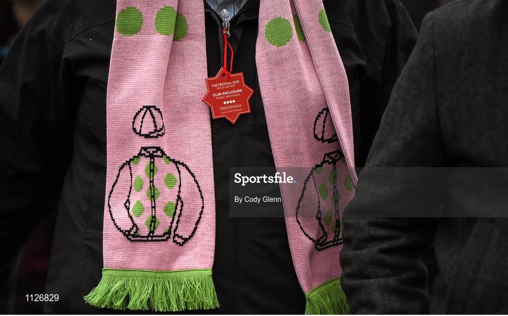 18 March 2016; A detailed view of a punter's scarf with the colours of Susannah and Rich Ricci ahead of day 4 at the races. Prestbury Park, Cheltenham, Gloucestershire, England. Picture credit: Cody Glenn / SPORTSFILE