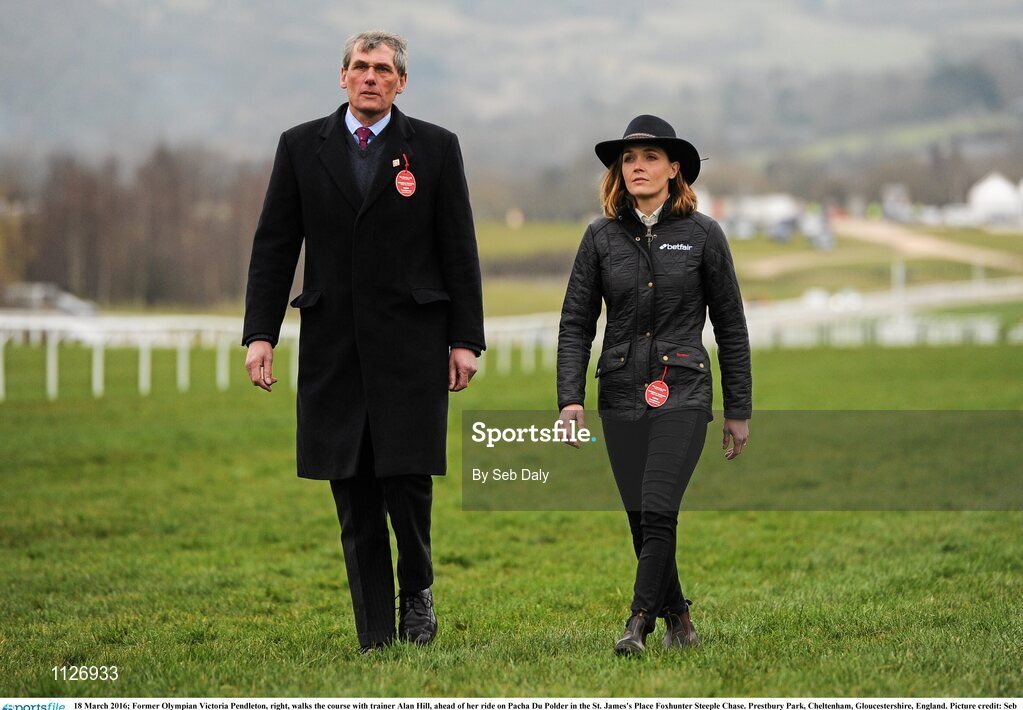 18 March 2016; Former Olympian Victoria Pendleton, right, walks the course with trainer Alan Hill, ahead of her ride on Pacha Du Polder in the St. James's Place Foxhunter Steeple Chase. Prestbury Park, Cheltenham, Gloucestershire, England. Picture credit: Seb Daly / SPORTSFILE