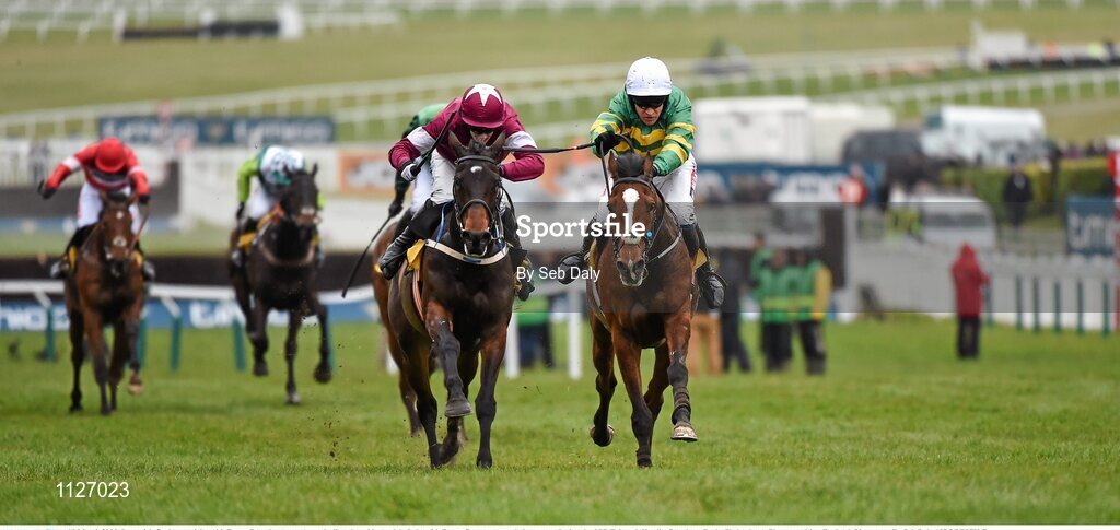 18 March 2016; Ivanovich Gorbatov, right, with Barry Geraghty up, races to the line alongside Apple's Jade, with Bryan Cooper up, on their way to winning the JCB Triumph Hurdle. Prestbury Park, Cheltenham, Gloucestershire, England. Picture credit: Seb Daly / SPORTSFILE