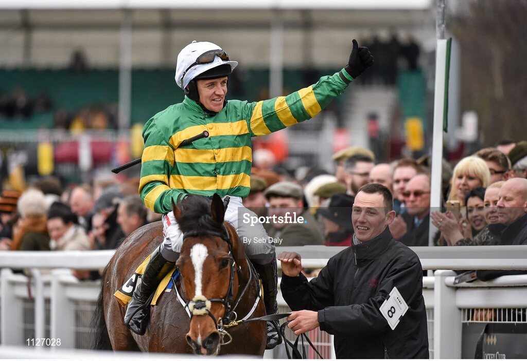 18 March 2016; Barry Geraghty acknowledges the crowd as he is led down in front of the grandstand after winning the JCB Triumph Hurdle on Ivanovich Gorbatov. Prestbury Park, Cheltenham, Gloucestershire, England. Picture credit: Seb Daly / SPORTSFILE