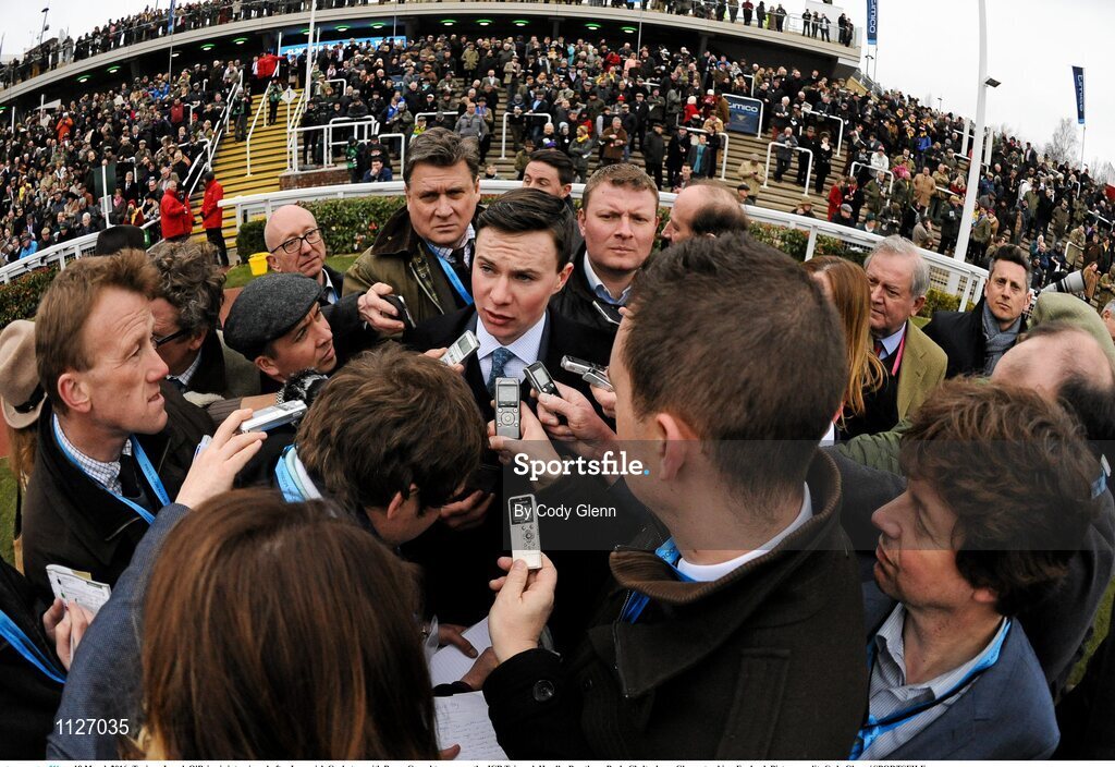 18 March 2016; Trainer Joseph O'Brien is interviewed after Ivanovich Gorbatov, with Barry Geraghty up, won the JCB Triumph Hurdle. Prestbury Park, Cheltenham, Gloucestershire, England. Picture credit: Cody Glenn / SPORTSFILE