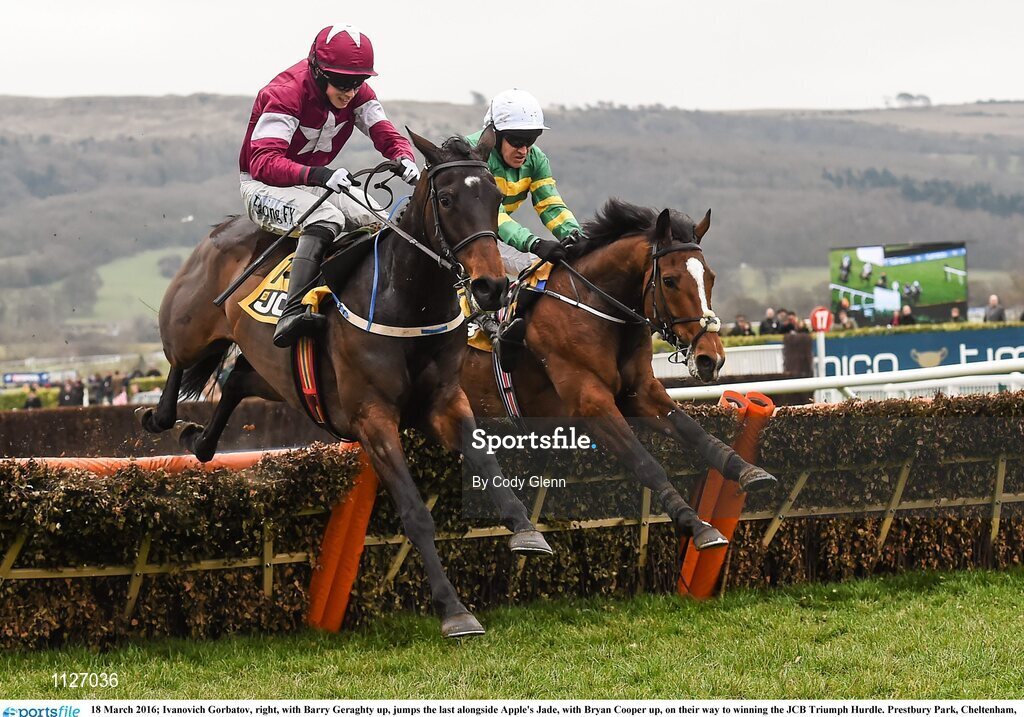 18 March 2016; Ivanovich Gorbatov, right, with Barry Geraghty up, jumps the last alongside Apple's Jade, with Bryan Cooper up, on their way to winning the JCB Triumph Hurdle. Prestbury Park, Cheltenham, Gloucestershire, England. Picture credit: Cody Glenn / SPORTSFILE