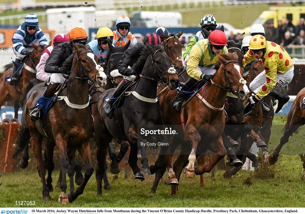 18 March 2016; Jockey Wayne Hutchinson falls from Montbazon during the Vincent O'Brien County Handicap Hurdle. Prestbury Park, Cheltenham, Gloucestershire, England. Picture credit: Cody Glenn / SPORTSFILE