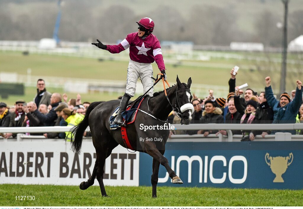 18 March 2016; Bryan Cooper celebrates as he crosses the line to win the Timico Cheltenham Gold Cup on Don Cossack. Prestbury Park, Cheltenham, Gloucestershire, England. Picture credit: Seb Daly / SPORTSFILE