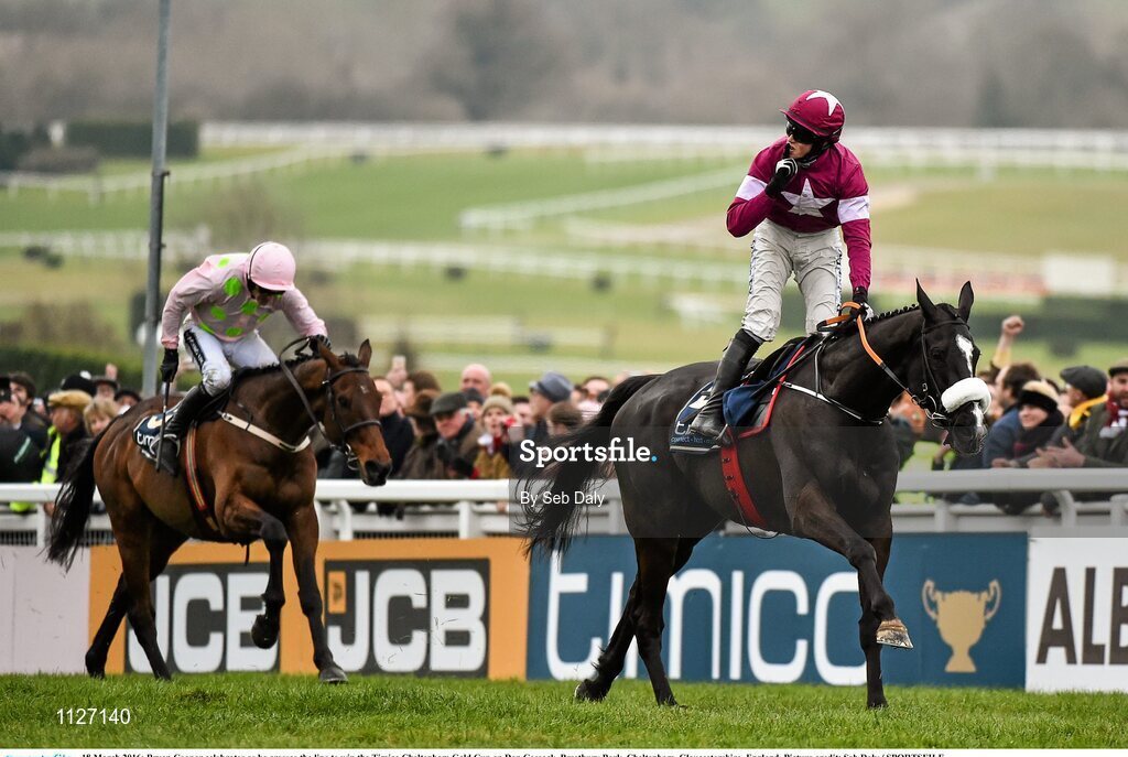 18 March 2016; Bryan Cooper celebrates as he crosses the line to win the Timico Cheltenham Gold Cup on Don Cossack. Prestbury Park, Cheltenham, Gloucestershire, England. Picture credit: Seb Daly / SPORTSFILE