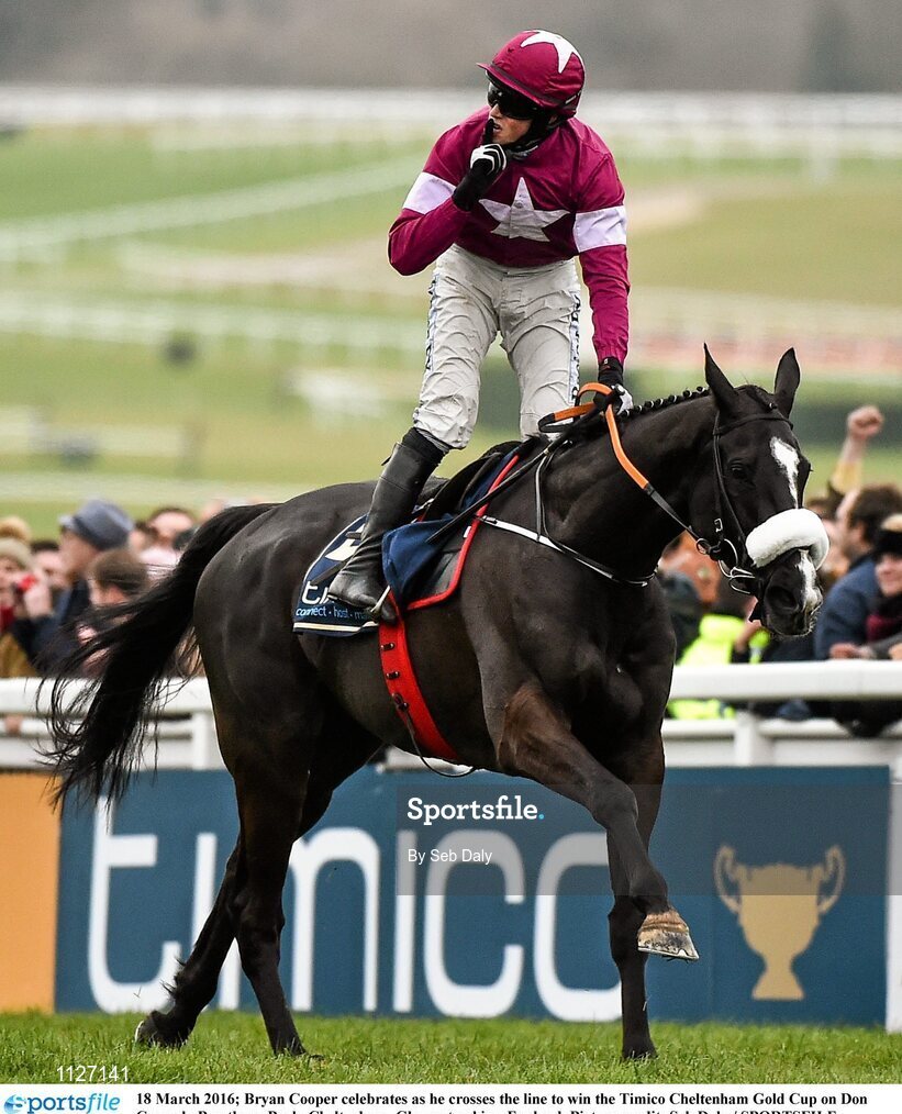 18 March 2016; Bryan Cooper celebrates as he crosses the line to win the Timico Cheltenham Gold Cup on Don Cossack. Prestbury Park, Cheltenham, Gloucestershire, England. Picture credit: Seb Daly / SPORTSFILE