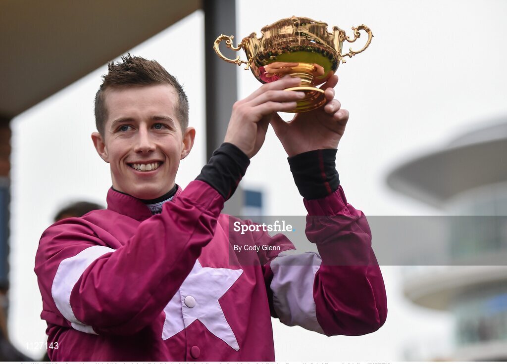 18 March 2016; Bryan Cooper celebrates with the Gold Cup after winning the Timico Cheltenham Gold Cup Steeple Chase on Don Cossack. Prestbury Park, Cheltenham, Gloucestershire, England. Picture credit: Cody Glenn / SPORTSFILE