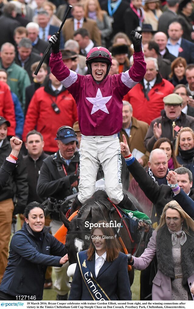 18 March 2016; Bryan Cooper celebrates with trainer Gordon Elliott, second from right, and the winning connections after victory in the Timico Cheltenham Gold Cup Steeple Chase on Don Cossack. Prestbury Park, Cheltenham, Gloucestershire, England. Picture credit: Cody Glenn / SPORTSFILE