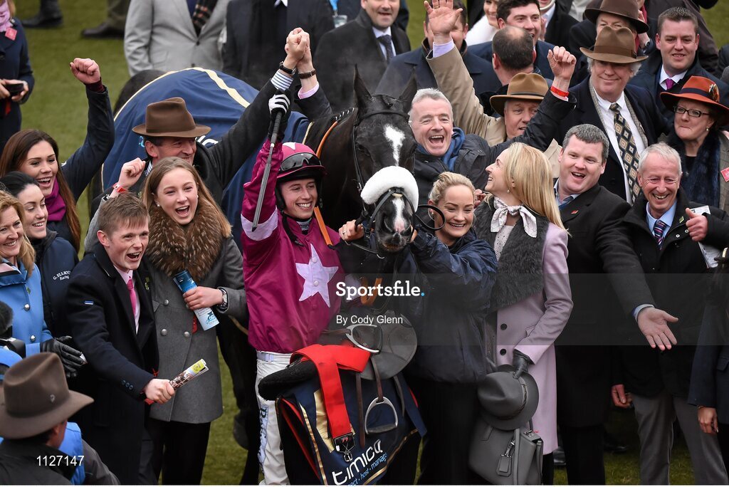 18 March 2016; Bryan Cooper celebrates with trainer Gordon Elliott, second from right, and the winning connections after victory in the Timico Cheltenham Gold Cup Steeple Chase on Don Cossack. Prestbury Park, Cheltenham, Gloucestershire, England. Picture credit: Cody Glenn / SPORTSFILE