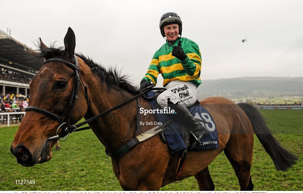 18 March 2016; Nina Carberry celebrates after winning the St. James’s Place Foxhunter Steeple Chase Challenge Cup on On The Fringe. Prestbury Park, Cheltenham, Gloucestershire, England. Picture credit: Seb Daly / SPORTSFILE