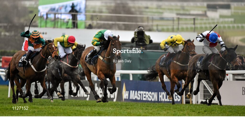 18 March 2016; On The Fringe, with Nina Carberry up, centre with white cap, on their way to winning the St. James’s Place Foxhunter Steeple Chase Challenge Cup. Prestbury Park, Cheltenham, Gloucestershire, England. Picture credit: Seb Daly / SPORTSFILE