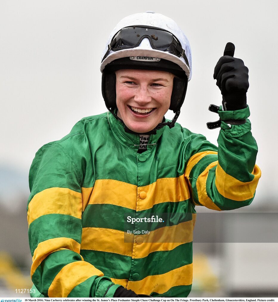 18 March 2016; Nina Carberry celebrates after winning the St. James’s Place Foxhunter Steeple Chase Challenge Cup on On The Fringe. Prestbury Park, Cheltenham, Gloucestershire, England. Picture credit: Seb Daly / SPORTSFILE