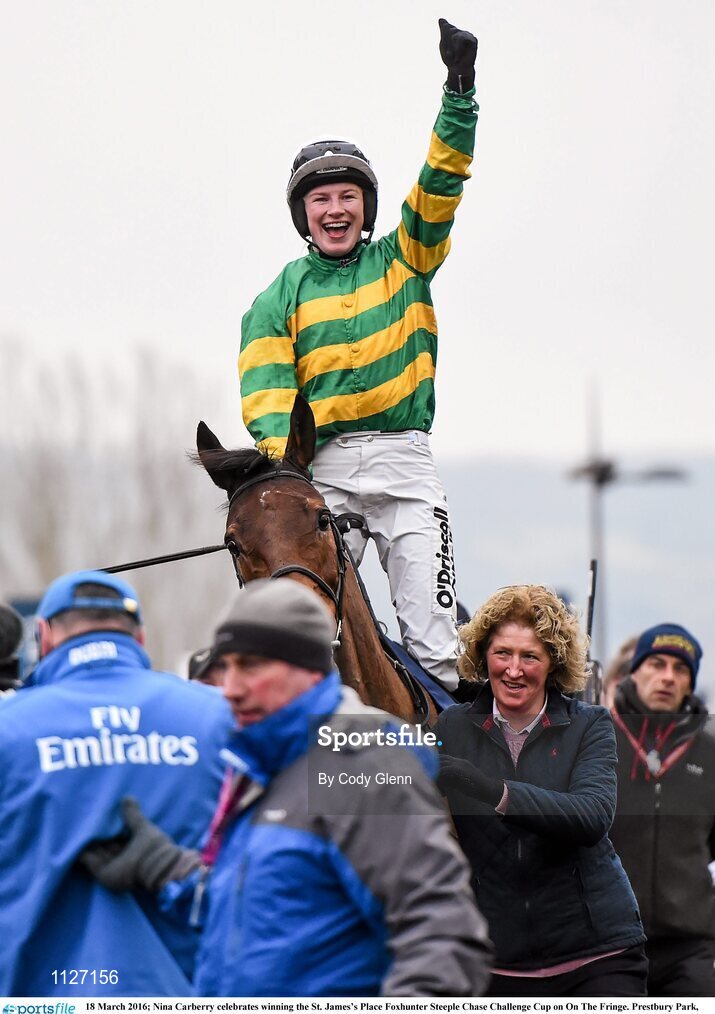 18 March 2016; Nina Carberry celebrates winning the St. James’s Place Foxhunter Steeple Chase Challenge Cup on On The Fringe. Prestbury Park, Cheltenham, Gloucestershire, England. Picture credit: Cody Glenn / SPORTSFILE