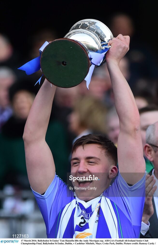 17 March 2016; Ballyboden St Endas' Tom Hannifin lifts the Andy Merrigan cup. AIB GAA Football All-Ireland Senior Club Championship Final, Ballyboden St Endas, Dublin, v Castlebar Mitchels, Mayo. Croke Park, Dublin. Picture credit: Ramsey Cardy / SPORTSFILE