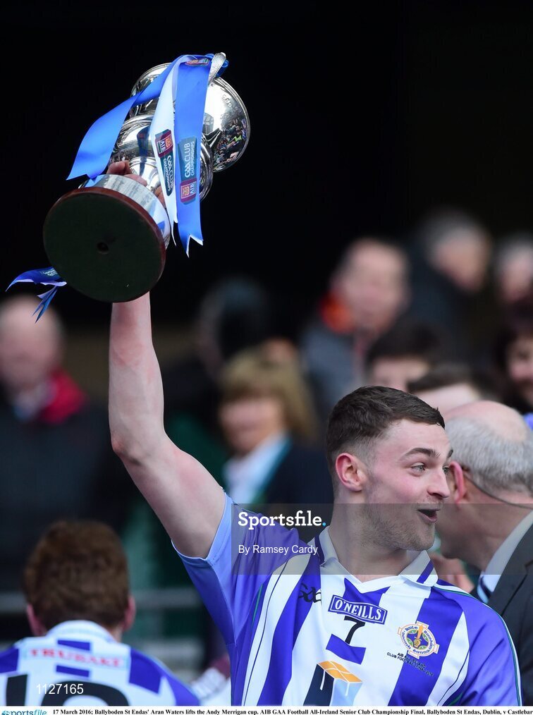 17 March 2016; Ballyboden St Endas' Aran Waters lifts the Andy Merrigan cup. AIB GAA Football All-Ireland Senior Club Championship Final, Ballyboden St Endas, Dublin, v Castlebar Mitchels, Mayo. Croke Park, Dublin. Picture credit: Ramsey Cardy / SPORTSFILE